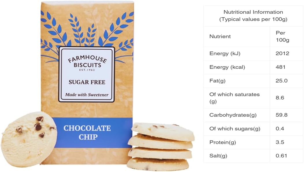 CHOCOLATE CHIP COOKIES-SUGAR FREE-A delicious shortcake base with added chocolate chips, always a real family favourite. Perfect for diabetics or anyone who is trying to reduce their sugar intake.
